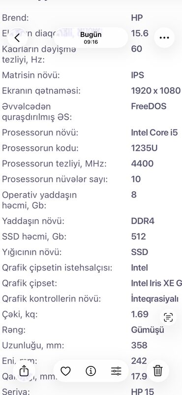 HP 15‑fd0131wm Əsas xüsusiyyətlər: - Brend/model: HP 15‑fd0131wm - Rəng: Natural Silver - Ekran: 15.6 düym FHD (1920×1080) IPS LED, 300 nit - Prosessor: Intel Core i3‑N305 (multi‑core), sürət 4.2...
