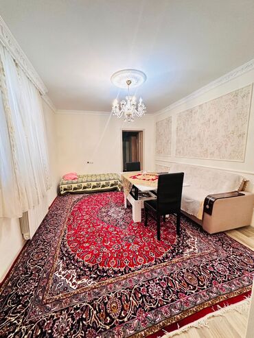 - Geniş və işıqlı qonaq otağı: dekorativ divar panelləri, kristal çilçıraq, pəncərədən nazik pərdə və radiator isitməsi. Otaqda yumşaq divan, yemək masası, stullar və iri naxışlı xalça yerləşir.