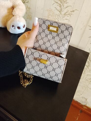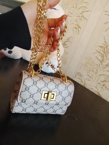 Mini çiyin/çapraz çanta ORJİNALDİR alınandan 1 dəfə bilə işlədilməyib - Rəng: açıq bej üzərində qrafik naxış - Material: teksturlu eko‑dəri (sünidəri) tipli örtük - Fittings: qızılı rəngli metal ...