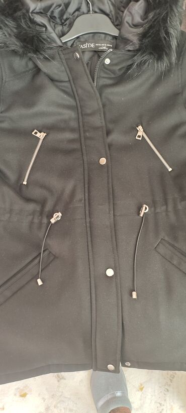Qara qadın parkası – XL ölçü - Material: xarici hissə qalın parça, iç hissə tam uzunluqda yumşaq süni kürk astar - Kapüşon kənarı: ağ tüklü süni kürk - Bağlanma: ön hissədə gizli fermuar və düyməl...