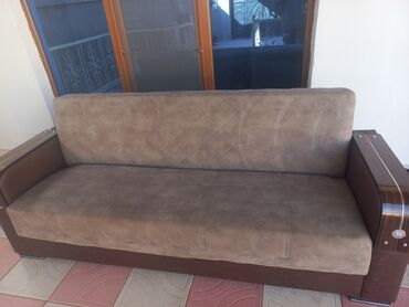 Divan və iki kreslodan ibarət yumşaq mebel dəsti - Tərkib: 1 böyük divan + 2 ədəd kreslo - Rənglər: qəhvəyi tonlarda, dekorativ qara taxta elementlərlə - Divan mexanizmi: açılıb-yığılır, rahat yat...
