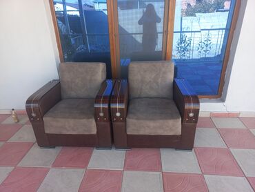 İkili kreslo dəsti. Birlikde 50 azn unvan Azadliq metronun duz yani - Model: 2 ədəd iri ölçülü kreslo - Rəng: tünd qəhvəyi, açıq bej dekor panelləri ilə - Material: yumşaq parça üzlük, yanlarda de...