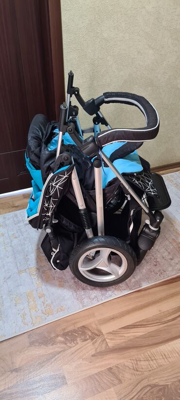 Klassik gəzinti arabasıTəkərlər amartizatorludur. Nasosla doldurulur. Nasos üstündədir. Şəkildə gördüyünüz bütün aksessuarlar üstündə verilir. Çox səliqəli istifadə olunub. əla vəziyyətdədir və manevrlidir. Arxada əl çantası boyda cibi, altında isə baqaj yeri var. Çox asan yığılır.