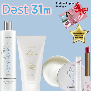Faberlic məhsulları – müxtəlif dəst və bakım vasitələri 1) Oxiology seriyası – 3’lük təmizlik komplekti: - Hidrofil gel-yağ (nasoslu flakon) - Miselar suyu, C vitamini ilə - Üz üçün skrab Şəkildə ...