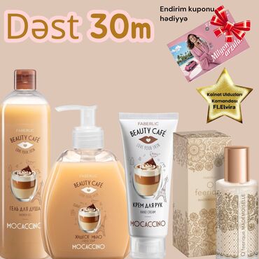 Şokolad-qəhvə ətirli Faberlic baxım dəsti Dəst 18 AZN Tərkib: - Duş geli (Beauty Café – Mocaccino) - Maye əl sabunu (Beauty Café – Mocaccino) - Mətbəx üçün krem-sabun (Aroma Control) - Əl kremi (...