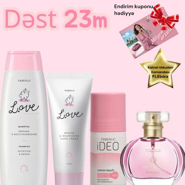 Faberlic brendinə aid komplekt – “Dəst 30 AZN”. Dəstdə görünən məhsullar: - Love şampun – qidalandırma və bərpa üçün. - La Crème duş geli (Aromatik Orxideya seriyası). - La Crème roll-on dezodoran...
