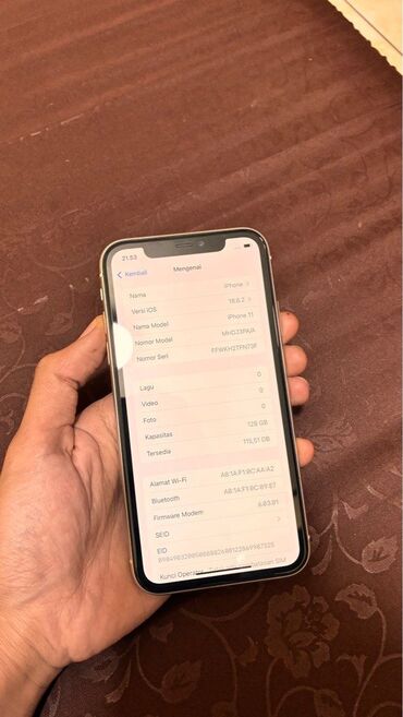 Apple iPhone 11 – 128 GB, ağ rəng Xüsusiyyətlər: - Model: iPhone 11 (Model nömrəsi: MHD3B/A) - Yaddaş: 128 GB (mövcud təxminən 113 GB) - Rəng: Ağ - iOS versiyası: 18.6.2 - Ekran: 6.1" Liquid Retin...