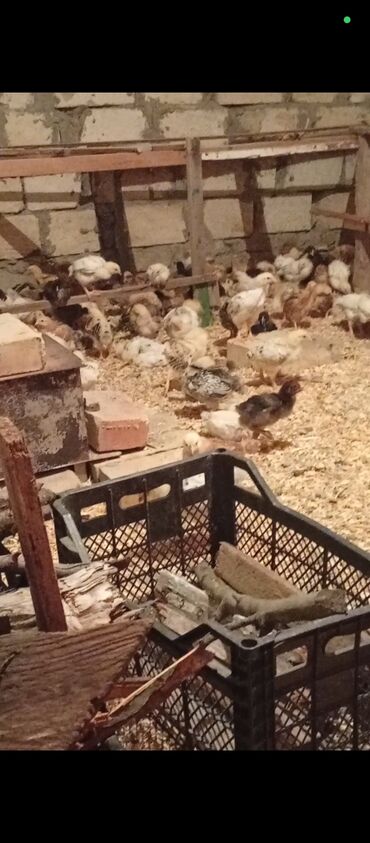 Məhsul: Cücələr (şəklinlərdəki yerli ətlik/yumurtalıq tipli gənc toyuqlar) Xüsusiyyətlər: - Yaş: fotolarda 17–24 sentyabr 2025 tarixlərində çəkilmiş gənc döşəməliklər - Rənglər: qarışıq – qara, tü...
