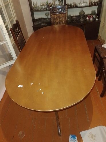 • Böyük oval yemək masası – geniş səth, ailə və qonaqlar üçün uyğundur, taxta material, sabit dayaqlar.