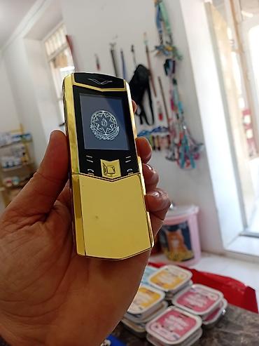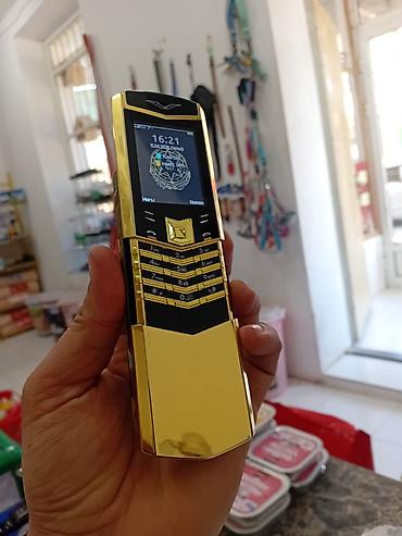 Vertu üslubunda klassik düyməli telefon - Korpus: qızılı tonlu metal çərçivə, arxa tərəf dəri teksturası ilə. Ön hissə parlaq metal panellə vurğulanıb. - Ekran: rəngli displey, saat və menyu qısa ...