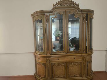- Vitrin şkafı: Şüşə qapılı, içəridə şüşə rəflər, yuxarı hissədə dekorativ oyma başlıq. Aşağı bölmədə qapalı dolablar və çekmecələr. Kənarları yarımdairə forması ilə yumşaldılmış.