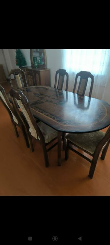 - Masa və 6 stul: Oval formalı, üstü naxışlı masa; yumşaq oturacaqlı, arxalıqlı stullar.