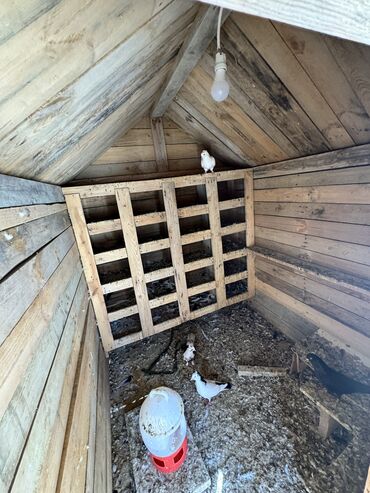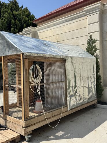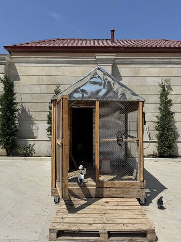 Açıq havada istifadə üçün taxta toyuq damları və voliər komplektləri - Material: təbii ağac konstruksiya, galvanizli tor şəbəkə; dam örtüyü suya davamlı. - Üst hissədə qapalı yuvalama/istirahət bö...