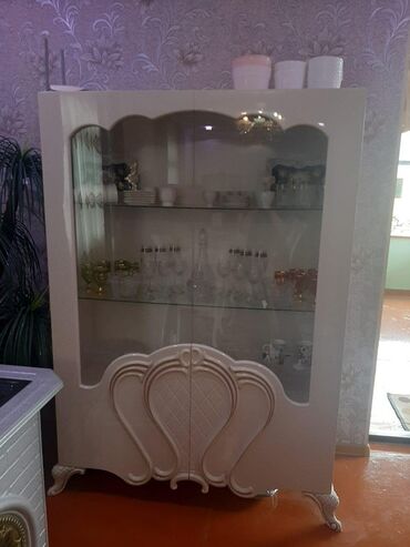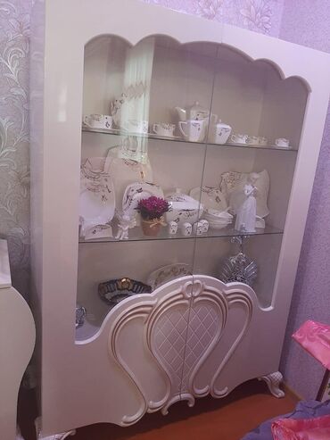 - 2 ədəd vitrin (şkaf): önü şüşəli, iki mərtəbəli şüşə rəflər, aşağı hissədə relyefli dekor panellər və fiqurlu ayaqlar. İçi qab-qacaq və aksesuar üçün genişdir.