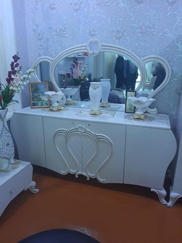 - Konsol güzgü ilə: iri oval güzgü kompozisiyası, üç bölməli şkaf hissəsi, mərkəzdə dekorativ relyef, üstü dekor yerləşdirmək üçün geniş səth.