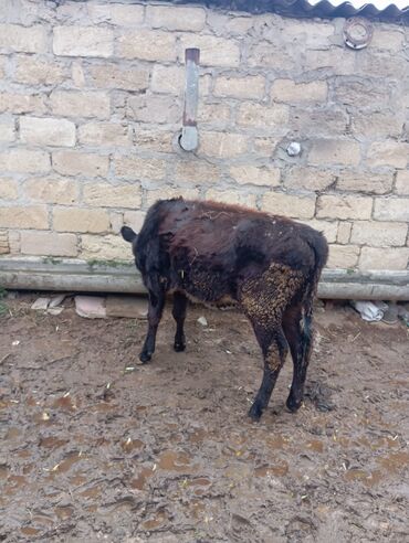 Satlıq buzov - Növ: iri buynuzlu heyvan, buzov - Rəng: açıq-qonur (qəhvəyi) tonlarda, alnında açıq ləkələr - Yun örtüyü: qalın və dalğalı, soyuğa dözümlü - Qulaqda nişan/etiket görünür - Bədən qur...