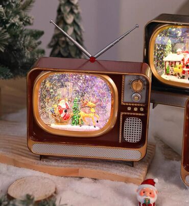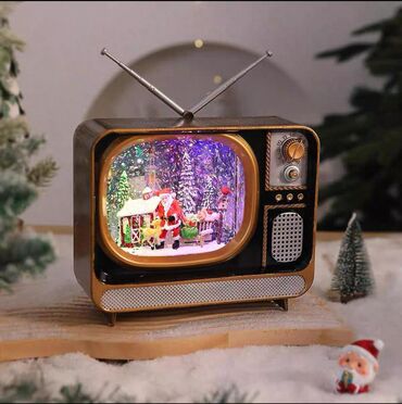 Retro üslublu dekorativ TV musiqili qlum. Ekranın içində Yeni il kompozisiyası: Şaxta baba, maral, şam ağacları və qar effekti ilə miniatür kənd səhnəsi. İşıq effektləri ilə rəngli parıltılar fırlanır, səhnə hərəkət hissi yaradır. Köhnə televiziya dizaynı: qızılı haşiyəli oval ekran, sağ tərəfdə dekorativ kanal düymələri və ızgaralı “səsucaldan” paneli, üstündə ikili antenna. Korpus iki rəngdə təqdim olunub: qırmızı-qızılı və tünd qəhvəyi-qızılı.