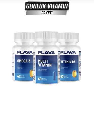 - 3 ayrı flakon: Omega 3, Multi Vitamin, Vitamin D3. Etiketdə “FLAVA” brendi, mavi-ağ dizayn. Üzərində “Günlük Vitamin Paketi” qeyd olunur.