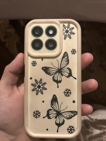 - Şəkillərdə qoruyucu örtük (bej rəng, kənarları qalın) və arxa tərəfdə kəpənək və qartopu/qar dənəsi naxışlı dizayn görünür