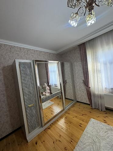 - Geyim şkafı: sürüşkən qapılı, mərkəzdə iri güzgü, kənarlarda teksturalı panellər və qızılı detal.
