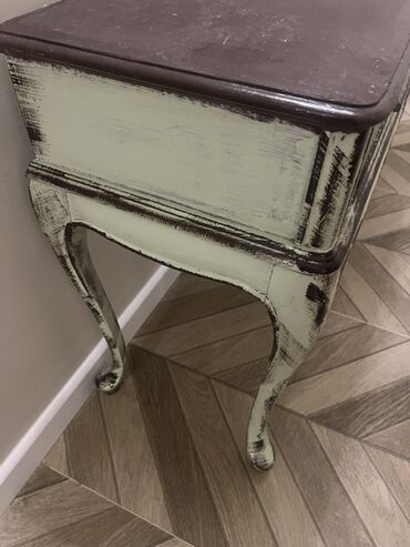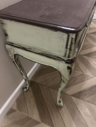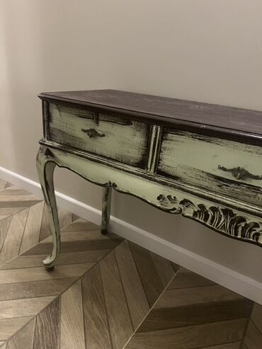 Retro üslubda hazırlanmış, üç çekmeceli konsol masası. Masa otağa zəriflik qatır. Qonaq otağı, dəhliz və ya yataq otağı üçün əlverişlidir. Dekorativ elementləri və əyri ayaqları ilə diqqət çəkir. Üzəri tünd rəngdədir, gövdəsi isə açıq rəngdə işlənib.
