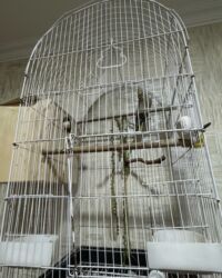 Başlıq: Papuqaylar satılır – qəfəs qarışıq, yanında yem də verilir Təsvir: - Nymfa (korella) papuqayları qəfəsdə birlikdə. - Qəfəs və aksesuarları (oturacaq budaqlar, yem qabı) daxil. - Yanında ye...