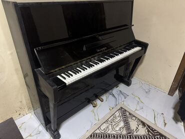 Upright piano – “Krasny Oktyabr” (Красный Октябрь) markalı, laklı qara korpus.