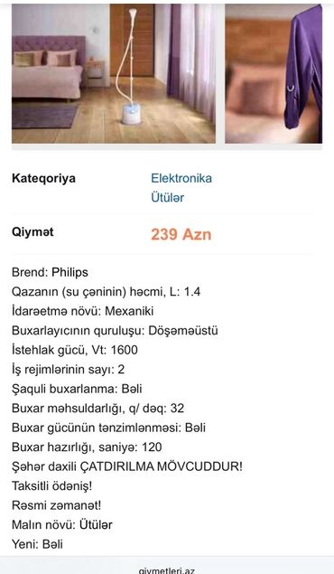 - Şaquli buxarlama sistemi: paltarları asılqan üzərində tez və rahat ütüləmə.
