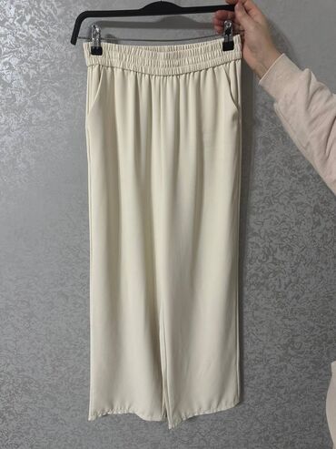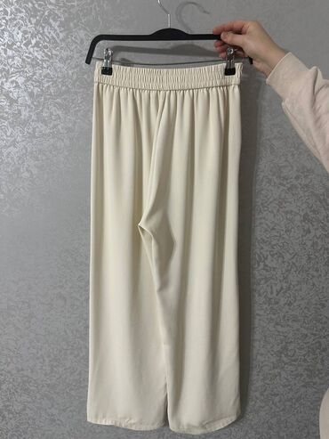 Bej rəngli qadın şalvarı - Kəsim: düz, geniş balaqlı, rahat oturuşlu - Material: nazik, axıcı parça (yüngül tekstura) - Rəng: açıq bej - Bel: kontrast ağ kəmər hissəsi, üstündə nazik qara dekorati...