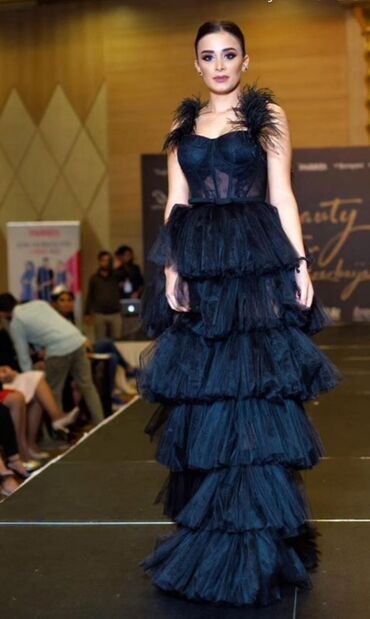 - Qara axşam/libas: yarı şəffaf korset üst, çiyin hissəsində tük/peyək detallar. Beldən başlayaraq çoxqatlı tül ətək mərtəbəli (kat-kat) konstruksiyaya malikdir və yerə qədər uzanır. Qrafik siluet, həcimli və səhnə/özəl tədbirlər üçün nəzərdə tutulan şıq görünüş.