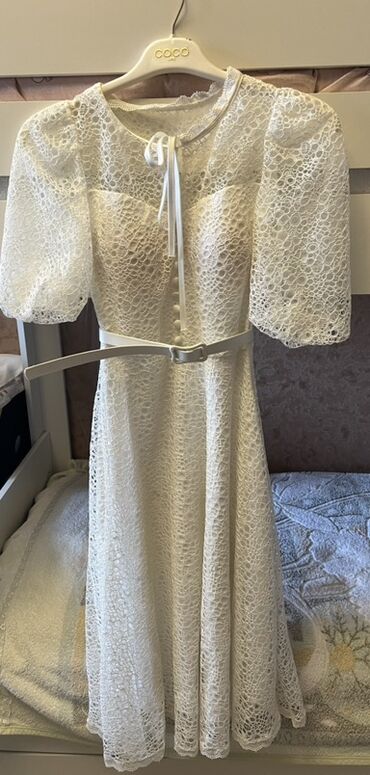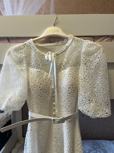 Ağ rəngli zərif qısa paltar 250 man alınıb 1 dəfə geyinilib - Model: Dantelli, dizdən yuxarı uzunluqda, korse kəsimli ön hissə - Yaxa: Bədbəzək daşlı broş və ikiqat ağ lentlə bəzədilmiş, balıqçı t...