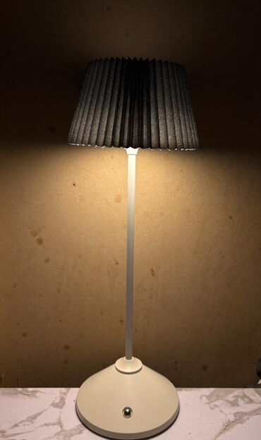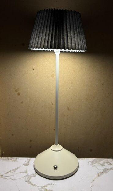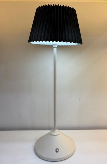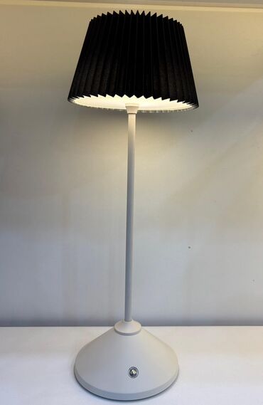- Dizayn: Ağ gövdə və konus formalı dayaq, qara/qrafit rəngli qatlanmış (pleytli) abaşur. Minimalist və şık görünüş.