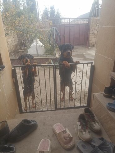 İki gözətçi it – Doberman və Rottweiler Doberman cüt satılır dişi ve erkerdi 1 dəfə doğuş olub .Rottveiler dişidi 3 yaş 1 defe doğuş olub. Təsvir: - Doberman: qara-qəhvəyi rəng, kəsik qulaqlar, a...