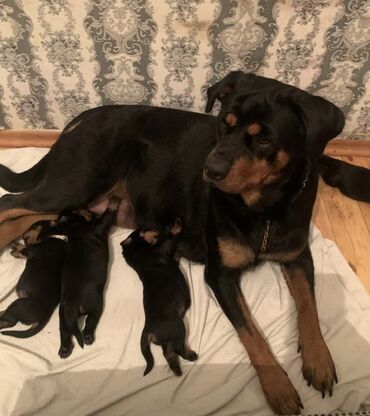Rottweiler dişi it və balaları Təsvir: - Cins: Rottweiler - Rəng: klassik qara-tan (qara kürək, qəhvəyi işarələr) - Bədən quruluşu: güclü skelet, əzələli, geniş döş qəfəsi, enli baş, qısa və parla...