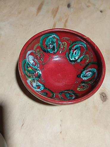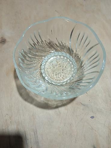- Şüşə meyvə/salat qabı: Dairəvi, yüngül dalğalı kənar, daxildə şüa tipli relyef və dibində dekorativ nöqtəvi naxış. Salat, meyvə, konfet üçün əlverişlidir.
