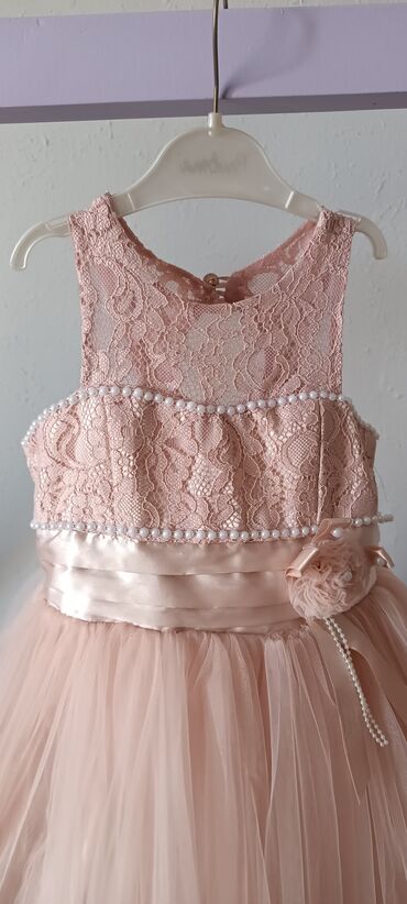 Qız uşaqları üçün zərif ziyafət/libas - Rəng: açıq çəhrayı (pudra tonunda) - Model: dizüstü, ətəyi laylı və yüngül, trapez kəsim - Üst hissə: şəffaf tül panel və çiçək naxışlı krujeva bəzəkləri - ...