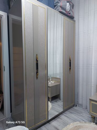 - Dolab: 4 qapılı, orta hissəsi geniş güzgülü. Açıq boz rəng, qızılı çərçivə və dekor xətləri, zərif tutacaqlar.