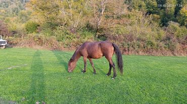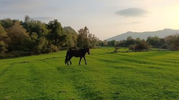 - Şəkillər açıq havada, dağətəyi ərazidə çəkilib; atın bədən quruluşu, rəngi və yerişi aydın görünür.