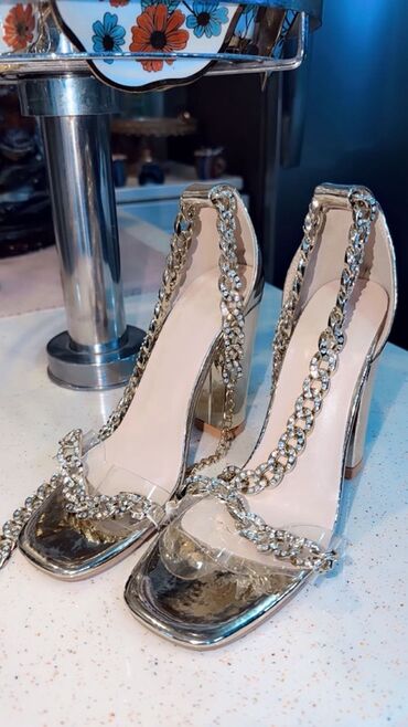 Qızılı rəngli qadın ayaqqabısı – zərli, daşlı - Model: açıq burunlu, kvadrat burun forması - Rəng: parlaq qızılı - Üst hissə: iki zolaqlı dizayn – ön zolaq və bilək ətrafı zolaq - Bəzək: hər iki z...