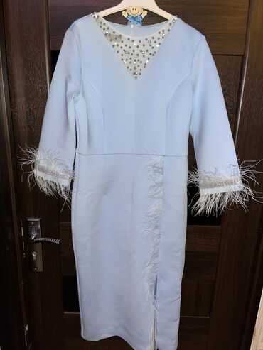 Mavi rəngli zərif ziyafət donu - Model: dizdən aşağı uzunluq, bədənə