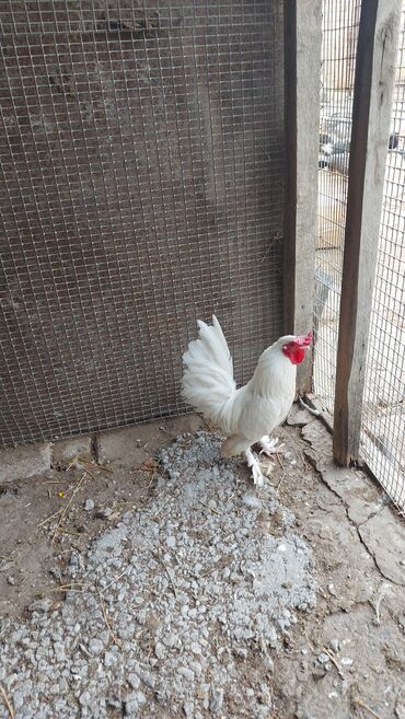 Məhsul: Ağ rəngli ev toyuğu (xoruz) Təsvir: - Tam ağ lələklər, qırmızı daraq və balaca asqısı olan sağlam xoruz. - Lələkli pəncələr: ayaqlarında tüklənmə var, dekorativ görünüş verir. - Kompakt bə...