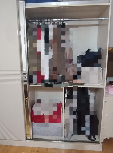 Güzgülü sürgülü şkaf - Ön hissəsi tam güzgülü iki sürgülü qapı ilə - Daxili quruluş: bir bölmədə paltar asmaq üçün metal asılqan borusu, digər bölmədə çoxsaylı açıq rəflər - Aşağı və orta hissədə ...