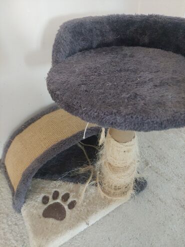 - Tək mərtəbəli, yumşaq plyüș üzlü pişik evi/layı: dairəvi yataq hissəsi və alt hissədə kətan tipli qaşıma paneli var. Dayaq sütunu sizal ip ilə sarınıb. Alt lövhədə pəncə naxışı.