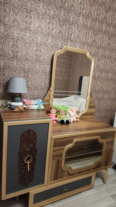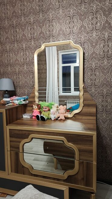Mebel: güzgülü tualet masası/komod dəsti - Üst hissə: iri dekorativ güzgü, klassik barokko üslubunda oyma çərçivə, qəhvəyi ağac tonlarında. - Alt hissə: komod/tuvalet masası, eyni rəng və tekstura...