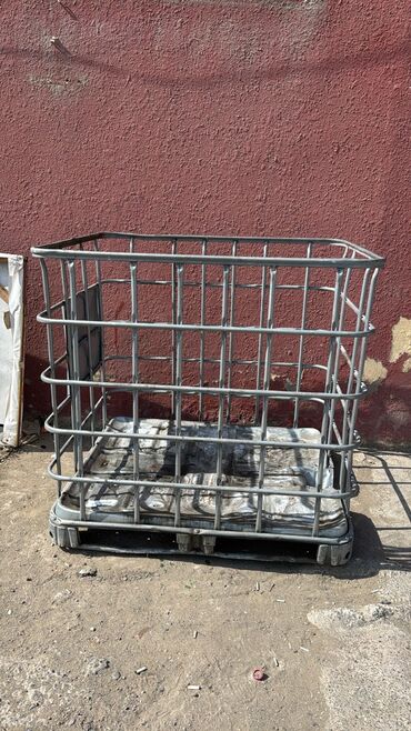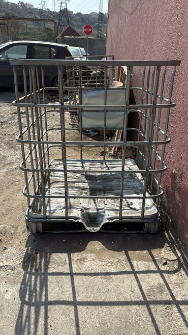 Metal qəfəs/konteyner karkası - Tip: IBC (1000 L) tipli çən üçün metal karkas - Material: qalın divarlı metal boru və şəbəkə konstruksiyası - Forma: düzbucaqlı, yumru bucaqlı möhkəm çərçivə - Ölçü...