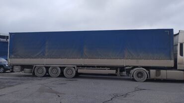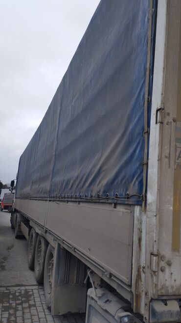 Yarasaqlı tentli yük qoşqusu (Perde/Tent yarımqoşqu) - Konstruksiya: 3 oxlu yarımqoşqu, tentli (çadır) üst örtük, arxa ikiqanadlı qapılar. - Şassi: mavi rəngli metal karkas, ön dayaqlı (krikolu) q...