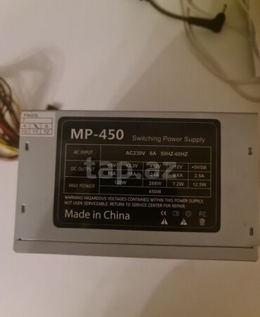 Masaüstü kompüter üçün ATX qalxanlı güc bloku işləkdir ünvan mərdekan - Model: Switching Power Supply, 450W (etiketdə Model: 450W) - Giriş: 230V, 5A, 50Hz - Maks. çıxış xətləri və cərəyanlar: - ...Giriş•Qeydiyyat