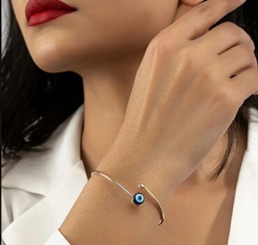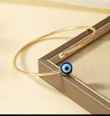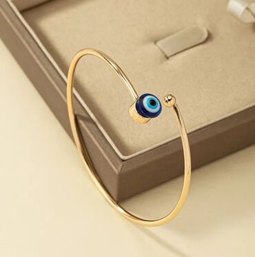 - Bilərzik: İnce, sərt bangle tipli qızılı halqa. Uclardan biri kiçik qızılı kürə, digəri isə mavi-ağ “nəzarət gözü” (badəgöz) motivli dekorla tamamlanıb. Açıq uclu quruluş sayəsində biləyə asan keçir.