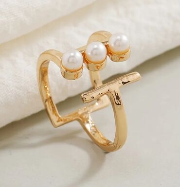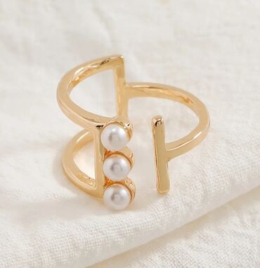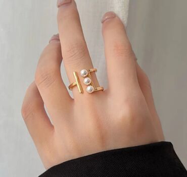 - Üzük: Açıq dizaynlı, tənzimlənən ölçü. İki paralel zolaqlı qızılı korpus, ön hissədə vertikal zərif xət və yanında üç ədəd kiçik inci bəzəyi ilə. Asimmetrik forma barmaqda yüngül və rahat oturuş yaradır, gündəlik və ziyafət obrazlarına uyğundur.