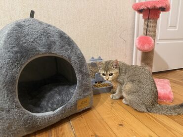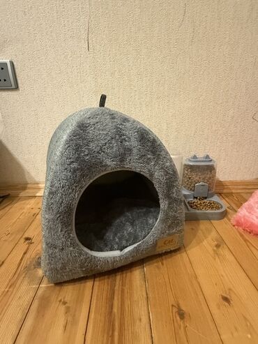- Komplektdə əlavə rahatlama yeri: boz rəngli, yumşaq, qalın dolduruculu pişik evi/alaçaq. Geniş giriş, içəridə çıxarıla bilən yumşaq döşək var.